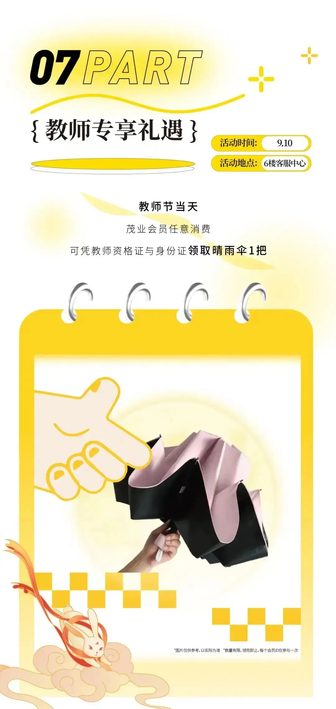 教师节当天,茂业会员任意消费,可凭教师资格证与身份证领取晴雨伞1把。