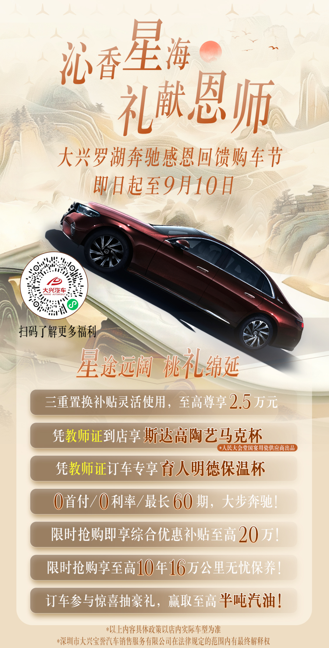 各品牌优惠幅度大。 在各项购车政策补贴加持下,罗湖辖区内的理想、腾势、问界AITO、阿维塔、比亚迪、奥迪、宝马、奔驰、沃尔沃、进口大众、上汽大众、一汽大众、广汽丰田、广汽埃安、领克、荣威、奇瑞新能源、五菱等主流热销中高端汽车品牌共同推出“感念师恩”教师节专场优惠购车活动 。