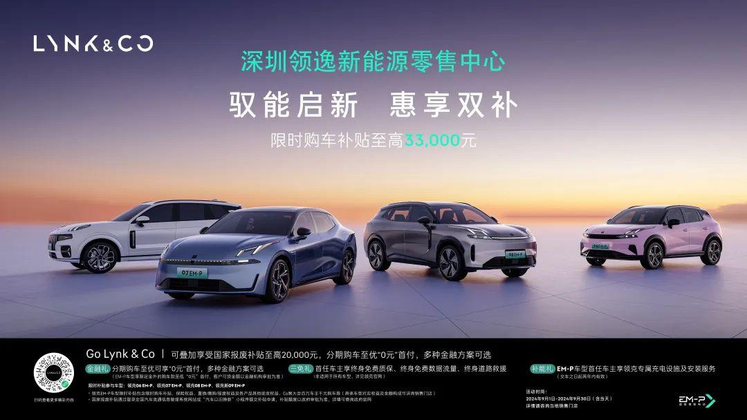 九月购领克新能源车型至高专享33000元限时补贴,到店即赠精美到店伴手礼一份,首付低至一成,轻松上深圳牌!