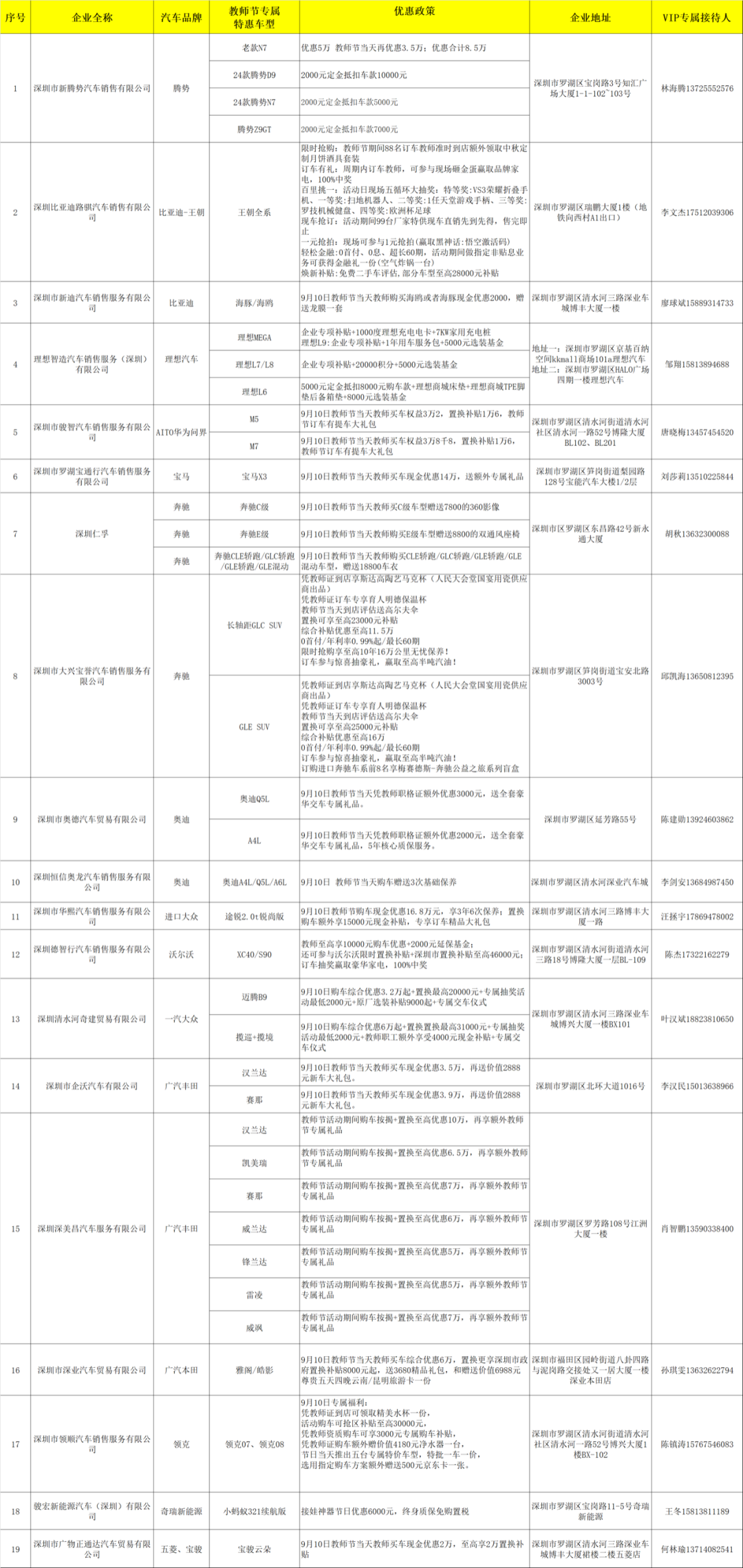 教师节期间,各企业推出重磅优惠,并安排专属VIP接待人员,详见表格。
