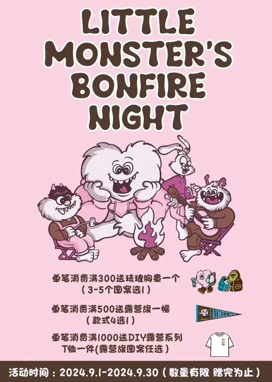 1.单笔消费满300元赠胸章一个、满500元送露营旗一幅、满1000元送DIY露营系列白色T恤一件;