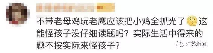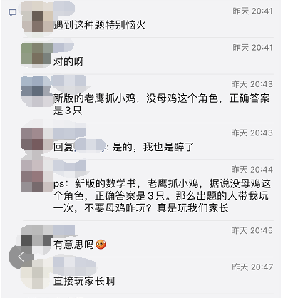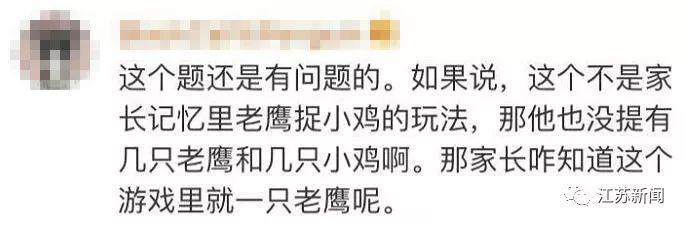 对于这道题,贵阳一小学数学老师说:“看了题后自己也不是很确定,确实有争议,很能理解现在家长的焦虑。但从数学的角度来说,这道题里只涉及老鹰和小鸡两个关系,老母鸡不用除,答案应该是3。”