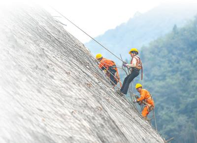 湖南道县一处工地,工人在峭壁上捆扎钢筋,进行生态修复。蒋克青摄(人民视觉)