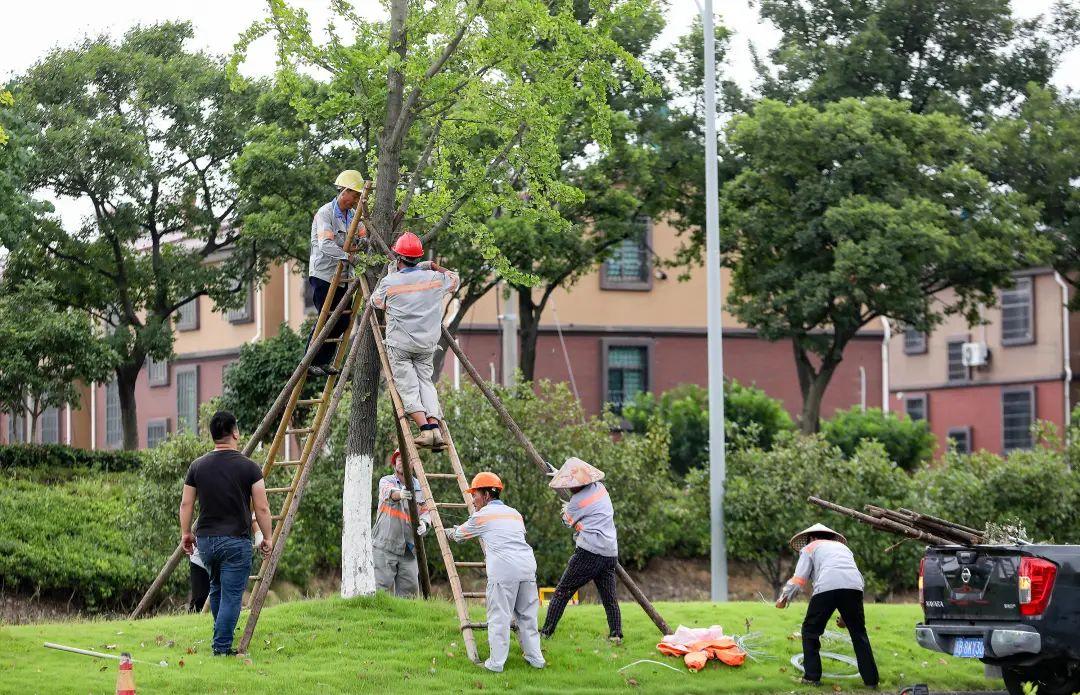 园林绿化养护中心针对管护范围内的大型乔木、行道树开展修剪加固作业,对风口大树进行整枝修剪,对浅根易倒伏树木进行支撑加固。同时,对主要道路、古树名木周边、公园设施及排水管线周边加强巡查,重点检查树木对周边电线、管线、路灯、交通标牌及建筑物等设施是否存在安全隐患,以及抗风能力较差或近三年内种植的大规格苗木是否需要加固等。