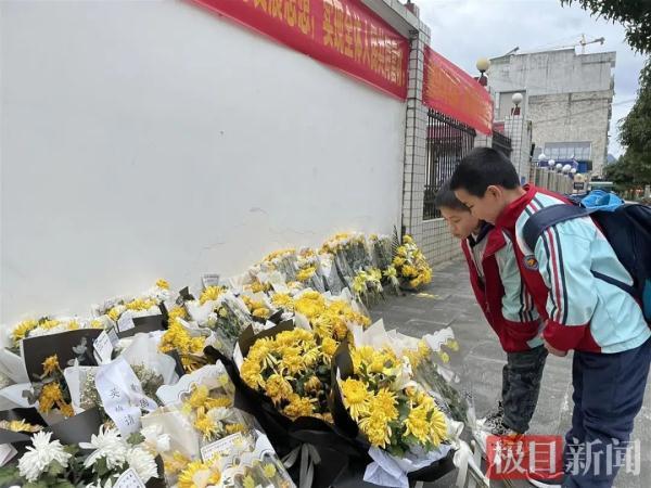 大化消防救援大队门口,放学的孩子正在看市民自发送的鲜花