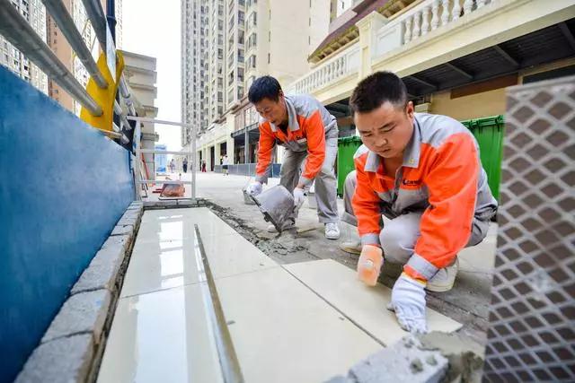 (花果园半山小镇综合维修人员正在铺设瓷砖)