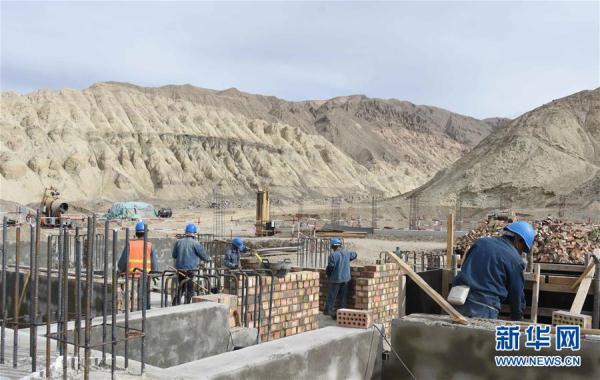去年末,“电线杆要来了”的消息在村子不胫而走。然而,给马尔洋乡送电不容易,喀喇昆仑山中,动不动下雪下雨,山顶垭口常年刮七八级大风;通往两个村86公里的输电线路中,最高的山头海拔4700米,工人们因为缺氧,每天可完成的工作量不足平原地区的一半。图为工人在搭建马尔洋乡输电工程的变电站。